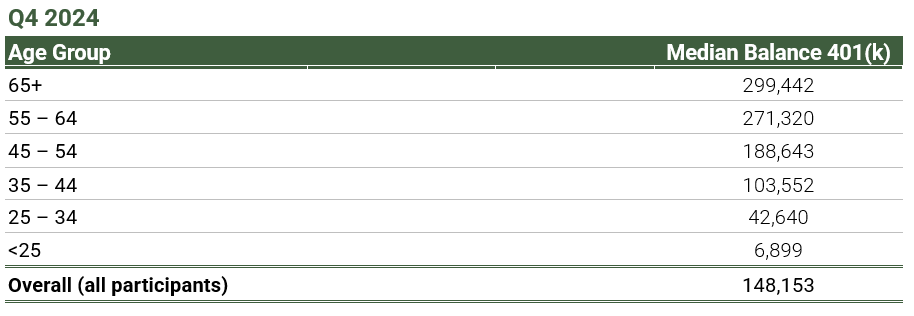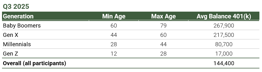 Data from major defined contribution plan providers indicate that households in prime homebuying years hold meaningful retirement assets. Fidelity reports average 401(k) balances for Millennials at approximately $80,000 as of Q3 2025, with median balances near $103,000 at year-end 2024 according to Vanguard. Given the strong equity market performance in 2025, balances are likely higher.